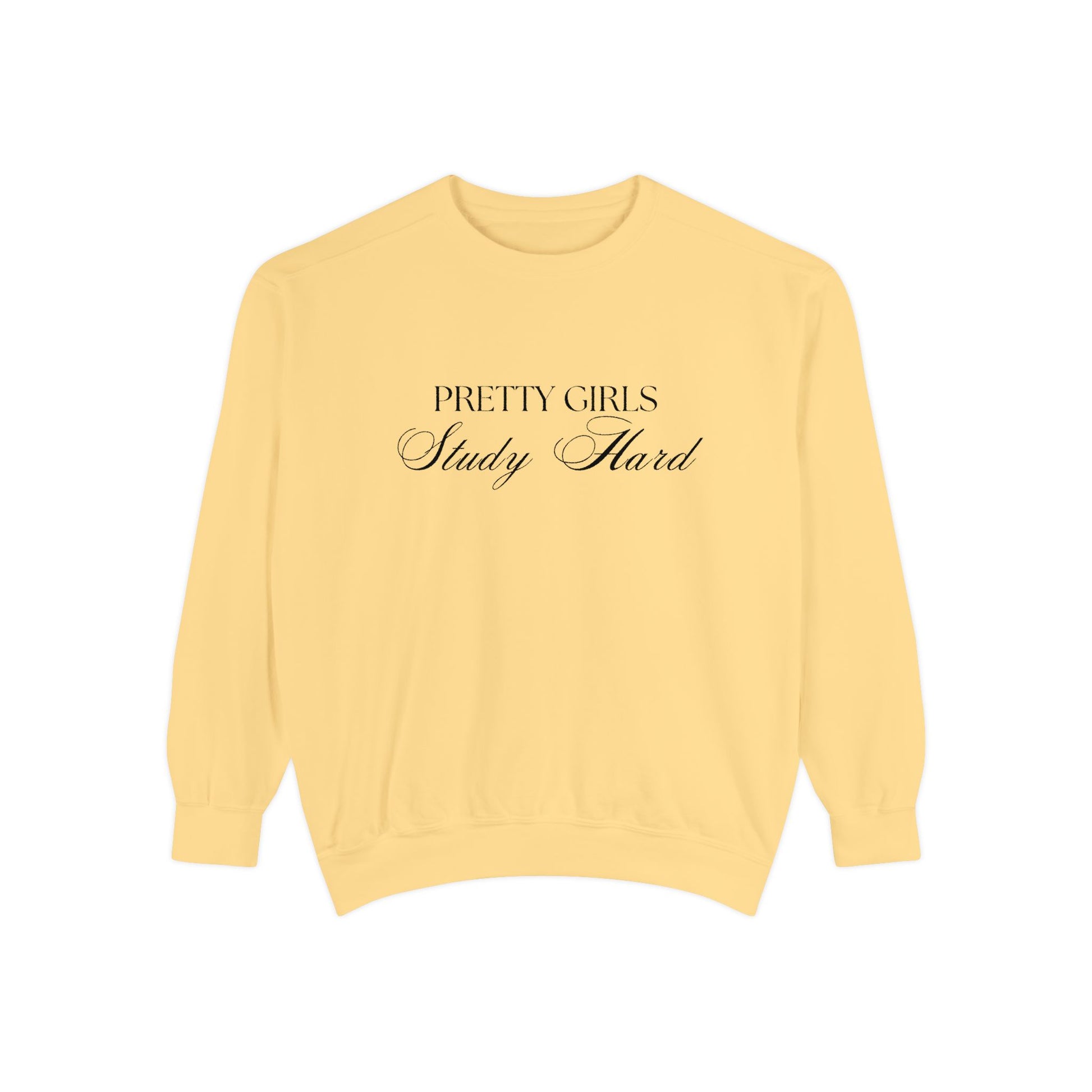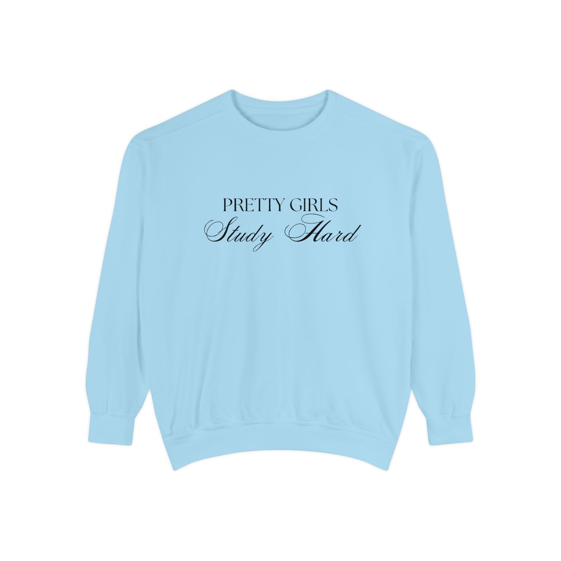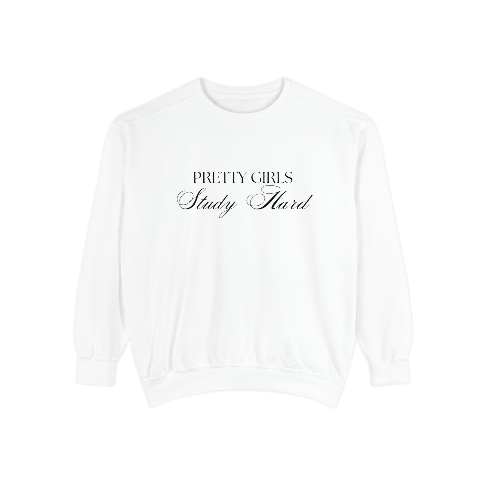 Trendy "pretty girls study hard" sweatshirt is perfect for the back to school season. Suitable for fans of TV shows, giving off a stylish and confident vibe. Ideal for students and fans of pop culture references. Relevant for back to school season and trendy fashion enthusiasts.